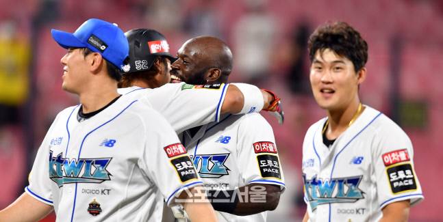 KT 3번타자 알포드가 17일 수원KT 위즈파크에서 열린 2022프로야구 KT위즈와 키움히어로즈의 경기 9회말 1사 1루에서 끝내기 안타를 터트린후 동료들과 자축하고 있다. 2022.8.17.