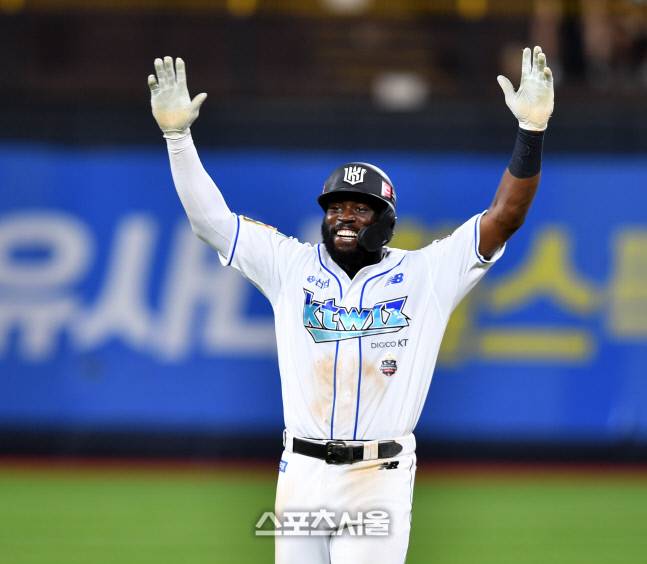 KT 3번타자 알포드가 17일 수원KT 위즈파크에서 열린 2022프로야구 KT위즈와 키움히어로즈의 경기 9회말 1사 1루에서 끝내기 안타를 터트린후 동료들과 자축하고 있다. 2022.8.17.
