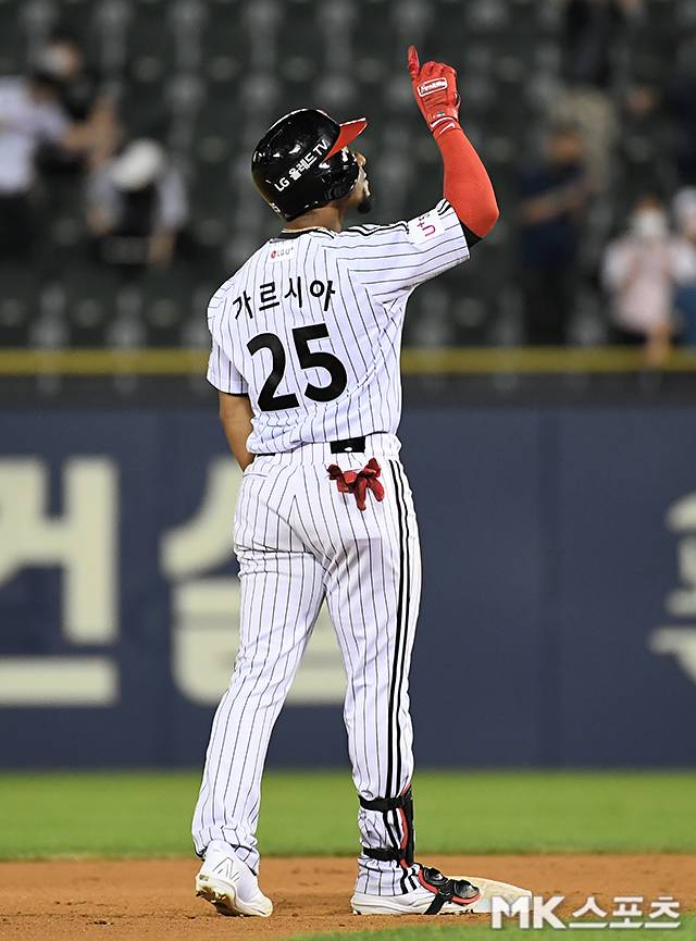 7회말 1사 1루에서 LG 가르시아가 1타점 2루타를 친 뒤 기뻐하고 있다.