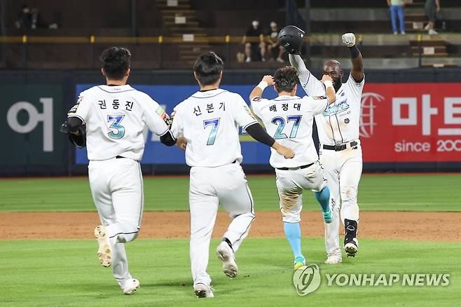 (수원=연합뉴스) 신현우 기자 = 17일 경기도 수원케이티위즈파크에서 열린 2022 프로야구 KBO리그 키움 히어로즈와 kt wiz의 경기에서 kt 알포드의 1타점 끝내기 안타로 kt가 승리한 뒤 알포드가 동료들과 기뻐하고 있다. 2022.8.17