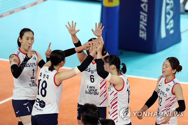 (순천=연합뉴스) 정회성 기자 = 17일 전남 순천시 팔마체육관에서 열린 2022 순천·도드람컵 프로배구대회 여자부 조별예선 흥국생명과 GS칼텍스의 경기. 5세트 득점에 성공한 GS칼텍스 선수들이 기뻐하고 있다. 이날 GS칼텍스가 세트스코어 3-2로 승리했다. 2022.8.17