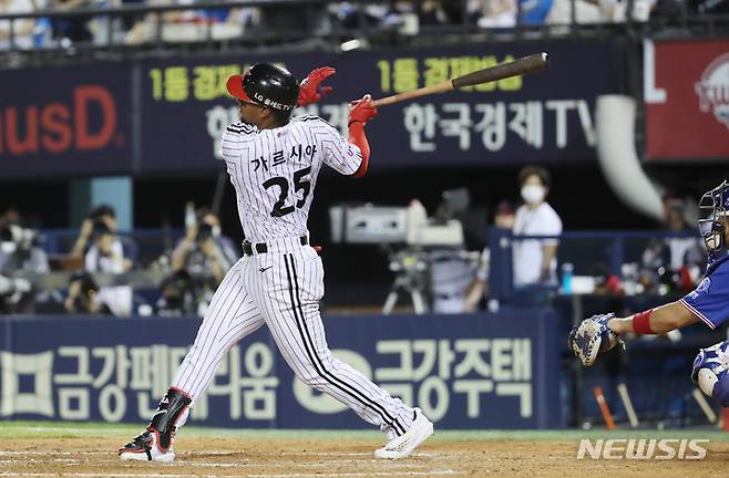 [서울=뉴시스] 김진아 기자 = 17일 오후 서울 송파구 잠실야구장에서 열린 2022 KBO리그 삼성 라이온즈와 LG 트윈스의 경기, 7회말 1사 1루 LG 가르시아가 1타점 2루타를 치고 있다. 2022.08.17. bluesoda@newsis.com