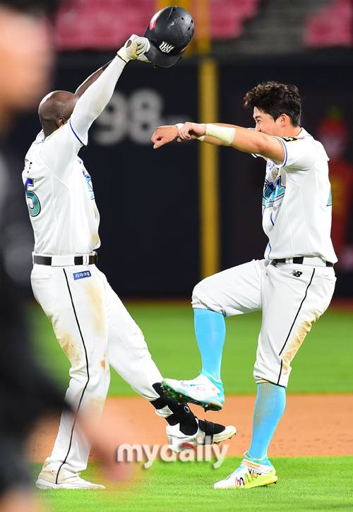 [마이데일리 = 수원 곽경훈 기자] KT 알포드가 17일 오후 경기도 수원 KT위즈파크에서 진행된 ''2022 신한은행 SOL KBO 리그' 키움-KT의 경기 2-2 동점이던 9회말 1사 1루에서 알포드의 끝내기 안타를 때린 뒤 배정대와 기뻐하고 있다.- ⓒ마이데일리(www.mydaily.co.kr). 무단전재&재배포 금지 -