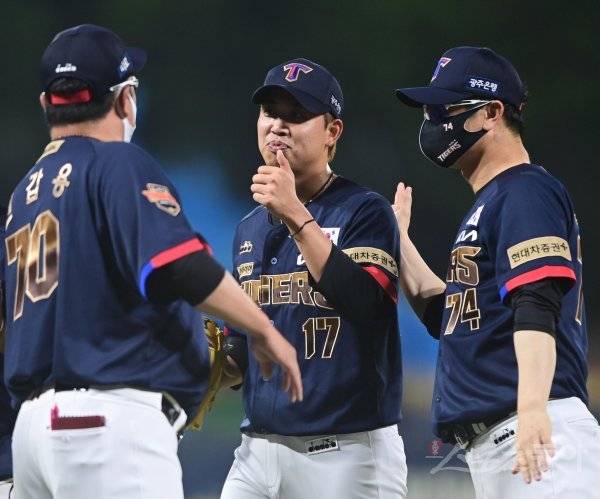 17일 광주기아챔피언스필드에서 열린 ‘2022 신한은행 SOL KBO리그’ KIA 타이거즈와 SSG 랜더스의 경기에서 SSG에 4-3으로 승리한 KIA 임기영이 김종국 감독과 기쁨을 나누고 있다.