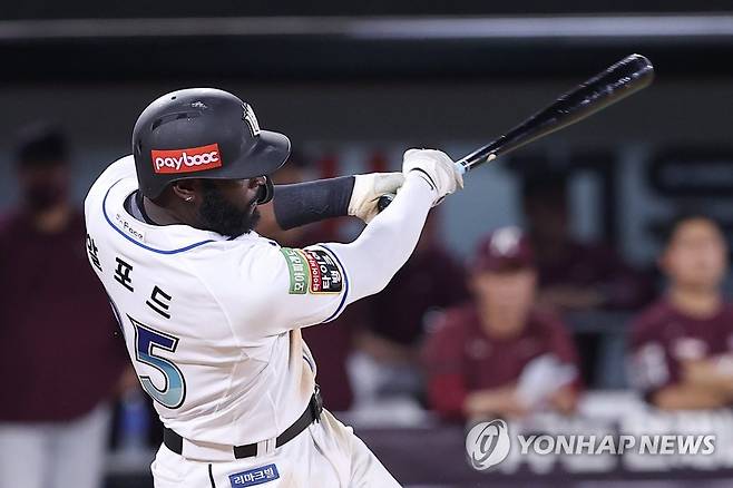 (수원=연합뉴스) 신현우 기자 = 17일 경기도 수원케이티위즈파크에서 열린 2022 프로야구 KBO리그 키움 히어로즈와 kt wiz의 경기. 9회말 1사 1루 kt 알포드가 1타점 2루타를 쳐내고 있다. 알포드 끝내기로 kt가 3-2로 승리. 2022.8.17