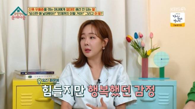 산후 우울증을 극복한 방법에 대해서는 "마음이 어떻게 풀어지느냐가 중요하다. 친구 김호영도 전화하면 너무 얘기를 잘 들어준다"고 설명했다.