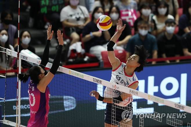 (순천=연합뉴스) 정회성 기자 = 17일 전남 순천시 팔마체육관에서 열린 2022 순천·도드람컵 프로배구대회 여자부 조별예선 흥국생명과 GS칼텍스의 경기. 4세트 GS칼텍스 문지윤의 공격을 흥국생명 김연경이 수비하고 있다. 2022.8.17
