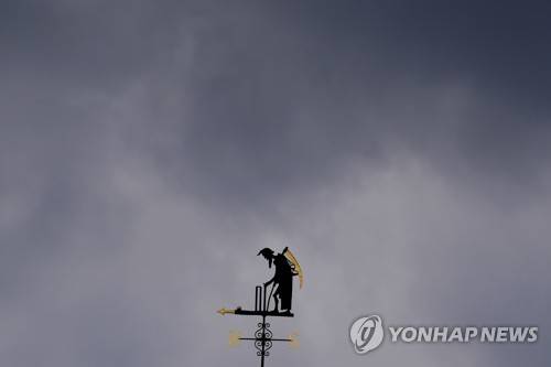 Dark clouds over the Father Time weathervane during the first day of the test match between England and South Africa at Lord's cricket ground in London, Wednesday, Aug. 17, 2022. (AP Photo/Kirsty Wigglesworth)
