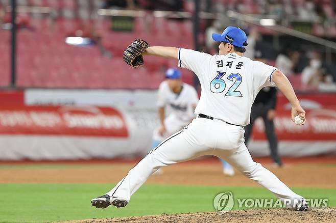 (수원=연합뉴스) 신현우 기자 = 17일 경기도 수원케이티위즈파크에서 열린 2022 프로야구 KBO리그 키움 히어로즈와 kt wiz의 경기. 9회초 교체 투입된 kt 김재윤이 역투하고 있다. 2022.8.17