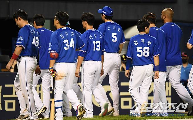 2022 KBO리그 LG 트윈스와 삼성 라이온즈의 경기가 17일 잠실구장에서 열렸다. 경기에서 패한 삼성 선수들이 아쉬워하고 있다. 잠실=박재만 기자 pjm@sportschosun.com/2022.08.17/