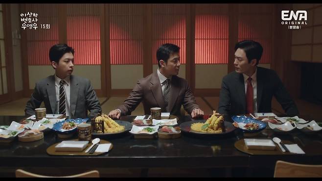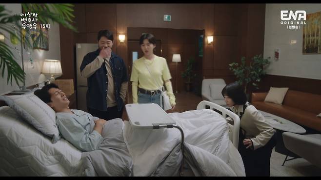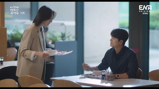 우영우는 이별을 선언한 후에도 이준호(강태오 분)를 향한 마음을 드러냈다. '한바디 인기남' 준호가 여자 직원들에 둘러싸여 점심을 먹는 동안 영우는 혼자 사무실에서 김밥 도시락을 먹었다. 그 모습을 본 최수연(하윤경 분)은 준호에게 헤어지는 이유조차 말해주지 않은 영우에게 "무슨 똥매너냐"며 답답해 했다.
