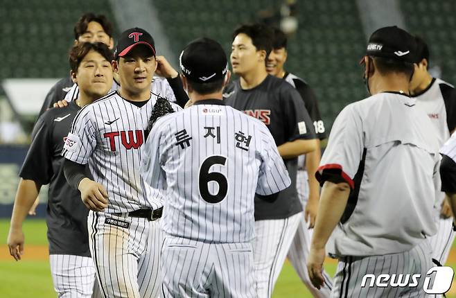 (서울=뉴스1) 김진환 기자 = 17일 오후 서울 송파구 잠실야구장에서 열린 '2022 신한은행 SOL KBO리그’ 삼성 라이온즈와 LG 트윈스의 경기, 11대7 승리를 거둔 LG 선수들이 기쁨을 나누고 있다. 2022.8.17/뉴스1