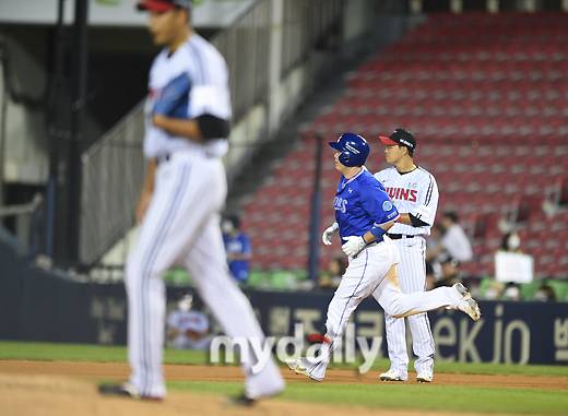 [마이데일리 = 유진형 기자] 삼성 이원석이 17일 오후 서울 잠실야구장에서 진행된 '2022 신한은행 SOL KBO리그' 삼성 라이온즈와 LG 트윈스의 경기 7회초 선두타자 홈런을 친 뒤 그라운드를 돌고 있다.