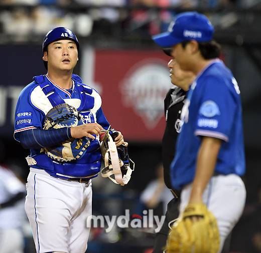[마이데일리 = 유진형 기자] 삼성 김재성 포수가 17일 오후 서울 잠실야구장에서 진행된 '2022 신한은행 SOL KBO리그' 삼성 라이온즈와 LG 트윈스의 경기 2회말 무사 만루서 삼성 더그아웃을 보고 있다.
