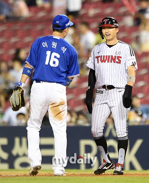 [마이데일리 = 유진형 기자] LG 2루주자 박해민이 17일 오후 서울 잠실야구장에서 진행된 '2022 신한은행 SOL KBO리그' 삼성 라이온즈와 LG 트윈스의 경기 2회말 무사 만루서 1타점 적시타를 친 뒤 삼성 1루수 이원석과 이야기를 나누고 있다.