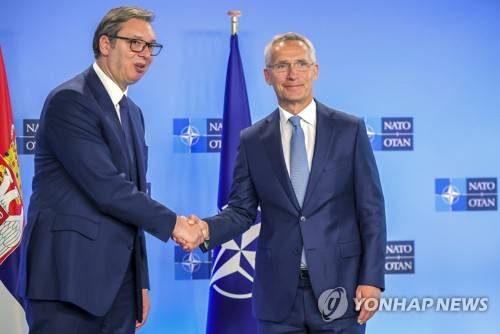 NATO Secretary General Jens Stoltenberg, right, shakes hands with Serbian President Aleksandar Vucic prior to a meeting at NATO headquarters in Brussels, Wednesday, Aug. 17, 2022. (AP Photo/Olivier Matthys)