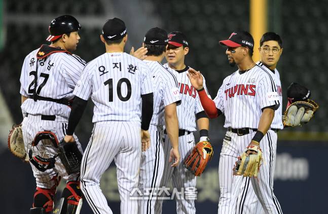 LG 선수들이 17일 잠실구장에서 열린 2022 KBO리그 삼성과의 경기에서 승리한 뒤 하이파이브를 하고 있다. LG는 삼성 상대 6연승을 기록했다. 2022. 8. 17.