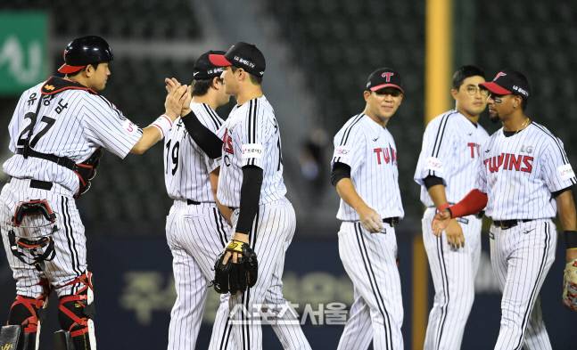 LG 선수들이 17일 잠실구장에서 열린 2022 KBO리그 삼성과의 경기에서 승리한 뒤 하이파이브를 하고 있다. LG는 삼성 상대 6연승을 기록했다. 2022. 8. 17.