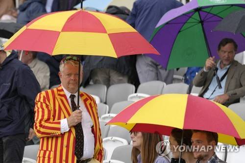 Members use umbrellas as rain stops play during the first day of the test match between England and South Africa at Lord's cricket ground in London, Wednesday, Aug. 17, 2022. (AP Photo/Kirsty Wigglesworth)