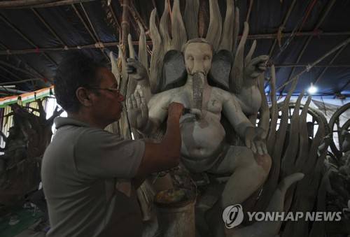 An artisan prepares eco-friendly idols of elephant-headed Hindu god Ganesha ahead of Ganesh Chaturthi festival in Hyderabad, India, Wednesday, Aug. 17, 2022. (AP Photo/Mahesh Kumar A.)