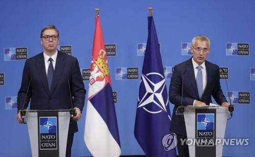 epa10125685 NATO Secretary General Jens Stoltenberg (R) gives a joint press conference with the President of the Republic of Serbia Aleksandar Vucic after a meeting at the Alliance headquarters in Brussels, Belgium, 17 August 2022. EPA/OLIVIER HOSLET