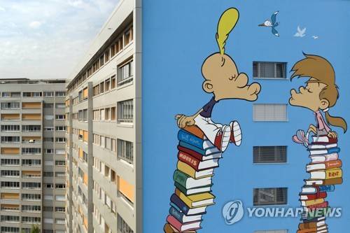 epa10125687 An image taken with a drone shows a new giant fresco from cartoon characters Titeuf and Nadia, a drawing by Swiss cartoonist Zep, the pseudonym of Philippe Chappuis, realized on an apartment block wall, in Lancy, Switzerland, 17 August 2022. EPA/SALVATORE DI NOLFI IMAGE TAKEN WITH A DRONE