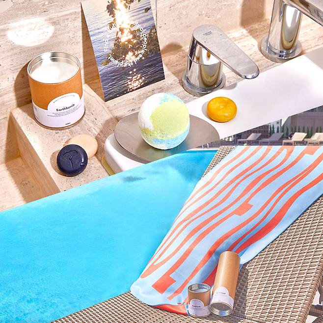 친환경 브랜드 '이든(Idden)'과 함께 선보인 '얼스 키트'로 바다에 버려진 폐플라스틱 20개를 업사이클링한 비치타월과 편백나무 향기를 담은 지구 모양 배스밤으로 구성됐다. 업사이클링 제품을 사용하며 자원 선순환에 동참하는 '제로 플라스틱 여행에 참여할 수 있다.