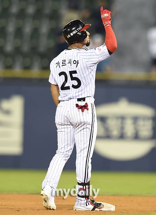 [마이데일리 = 유진형 기자] LG 가르시아가 17일 오후 서울 잠실야구장에서 진행된 '2022 신한은행 SOL KBO리그' 삼성 라이온즈와 LG 트윈스의 경기 7회말 1사 1루서 1타점 2루타를 친 뒤 기뻐하고 있다.