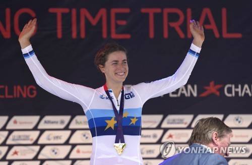 Gold medalist Switzerland's Marlen Reusser celebrates her victory in Women's Individual Time Trial during the European Cycling Championships in Fuerstenfeldbruck, Germany, Wednesday, Aug. 17, 2022. (AP Photo/Pavel Golovkin)