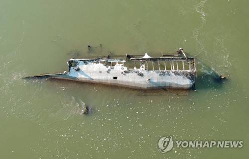 Low water level reveals wreck of a ship that sunk during WWII in the River Danube
