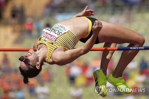 Carolin Schaefer, of Germany, makes an attempt in the Women's heptathlon high jump during the athletics competition in the Olympic Stadium at the European Championships in Munich, Germany, Wednesday, Aug. 17, 2022. (AP Photo/Matthias Schrader)