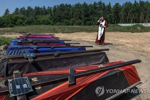 epa10125716 Orthodox priest Andrii Halavin blesses the remains of unidentified people who were killed in the Bucha district at the time of the Russian occupation, during the burial at a cemetery in Bucha, Ukraine, 17 August 2022. Months after the withdrawal of the Russian forces from the Bucha district, those bodies that were not identified were buried marked with numbers at a cemetery in Bucha. Bucha as well as other towns and villages in the northern part of the Kyiv region became battlefields when Russian troops tried to reach the Ukrainian capital of Kyiv in February and March 2022. Russian army on 24 February entered Ukrainian territory, starting a conflict that has provoked destruction and a humanitarian crisis. EPA/ROMAN PILIPEY
