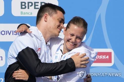Lou Massenberg and Tina Punzel of Germany celebrate the gold medal on the podium of the diving mixed syncro 3M springboard at the European swimming championships, in Rome, Wednesday, Aug. 17, 2022. (AP Photo/Gregorio Borgia)