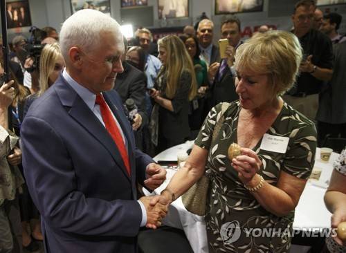 epa10125727 Former US Vice President Mike Pence talks with a member of the audience during a visit to the 'Politics and Eggs,' business gathering of the New Hampshire Institute of Politics, at St Anselm College in Manchester, New Hampshire, USA, 17 August 2022. Pence was on a one-day visit to the State of New Hampshire to campaign for local Republican candidates and address Republican voters ahead of the 2022 midterm elections. EPA/CJ GUNTHER