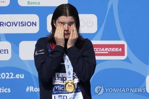 A. Sirieix Spendolini of Britain cries holding the gold medal on the podium of the women's diving platform, at the European swimming championships, in Rome, Wednesday, Aug. 17, 2022. (AP Photo/Gregorio Borgia)