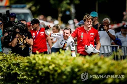 epa10125789 Lisa Brennauer of Germany after the Cycling Road - Women's Individual Time event at the European Championships Munich 2022, Fuerstenfeldbruck, Germany, 17 August 2022. EPA/LEONHARD SIMON