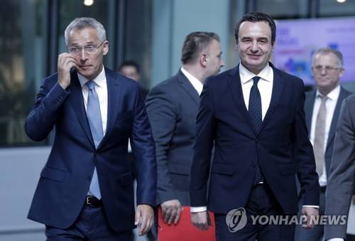 epa10125810 NATO Secretary General Jens Stoltenberg (L) welcomes Kosovo's Prime Minister Albin Kurti (R) ahead of their meeting at the Alliance headquarters in Brussels, Belgium, 17 August 2022. EPA/OLIVIER HOSLET