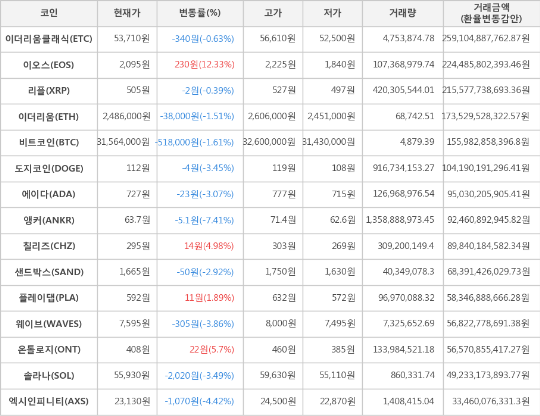 가상화폐 비트코인 -1.61% 하락, 이오스 12.33% 상승