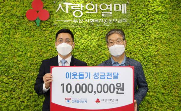부산사랑의열매(회장 최금식)는 지난 16일 성광물산상사(대표 김선관)가 수해를 입은 이재민을 돕기 위해 1000만 원을 기부(사진)했다고 17일 밝혔다. 성금은 집중호우로 많은 피해를 입은 지역의 복구와 수재민을 위한 생필품 지원 등에 사용된다.