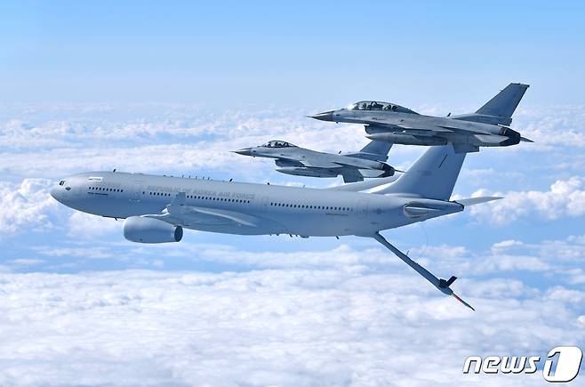 공군 KF-16 2대와 KC-330 다목적 공중급유수송기 1대가 피치블랙 훈련 전개에 대비해 사전 공중급유 훈련을 하고 있다. (공군 제공) 2022.8.18/뉴스1