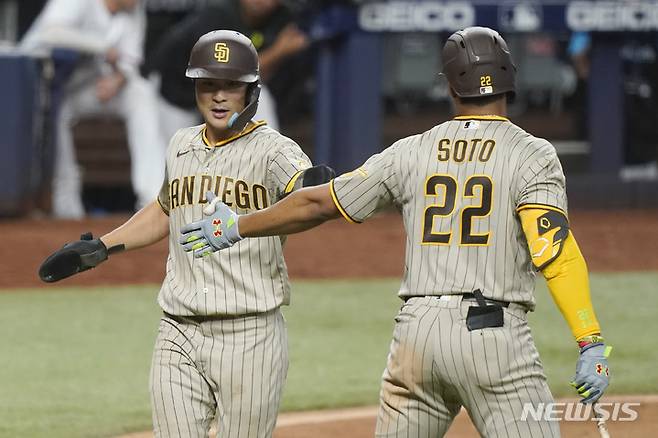 [마이애미=AP/뉴시스] 샌디에이고 파드리스의 김하성(왼쪽)이 17일(현지시간) 미 플로리다주 마이애미의 론디포 파크에서 열린 2022 메이저리그 마이애미 말린스와의 경기 8회 초 볼넷으로 걸어 나가 3루까지 진루해 상대 투수 폭투 때 홈인하고 있다. 김하성은 4타수 3안타 4타점 1득점의 활약을 펼치며 팀의 10-3 승리에 이바지했다. 2022.08.18.