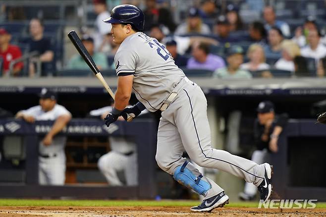 [뉴욕=AP/뉴시스] 탬파베이 레이스의 최지만이 17일(현지시간) 뉴욕의 양키 스타디움에서 열린 2022 메이저리그 뉴욕 양키스와의 경기 2회 초 선행주자를 포스아웃시키는 1루수 앞 땅볼을 치고 있다. 2022.08.18.