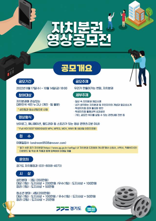 경기도는 자치분권 인식확산과 참여 활성화를 위해 오는 10월 14일까지 '2022년 경기도 자치분권 영상공모전'을 개최한다고 18일 밝혔다.