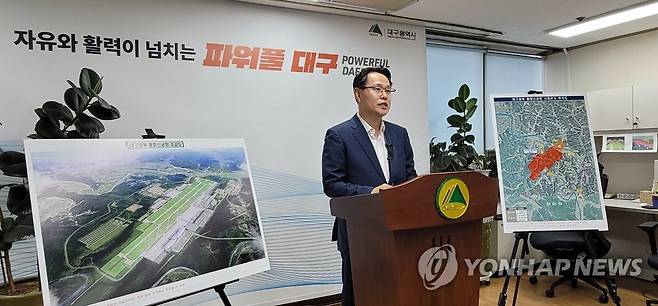 (대구=연합뉴스) 이덕기 기자 = 대구시 배석주 신공항건설본부장이 18일 대구경북통합신공항 건설 기본계획 수립 관련 기자회견을 열어 이전 사업 청사진을 제시하고 있다. 2022.8.18. duck@yna.co.kr
