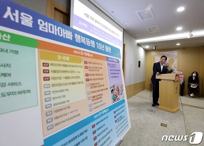 (서울=뉴스1) 이동해 기자 = 오세훈 서울시장이 18일 오전 서울시청 브리핑룸에서 육아 걱정 없는 도시를 만들기 위한 '엄마아빠 행복 프로젝트'를 발표하고 있다. 2022.8.18/뉴스1