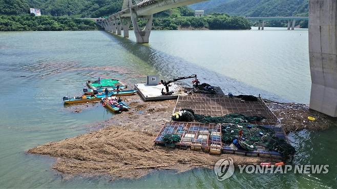 (인제=연합뉴스) 강원 인제군은 최근 집중호우로 인해 소양호 상류 일원에 떠내려온 부유물 등을 수거하는 환경정화사업을 했다고 18일 밝혔다. 사진은 지난 16일 환경정화 활동 모습. 2022.8.18 [인제군 제공. 재판매 및 DB 금지]