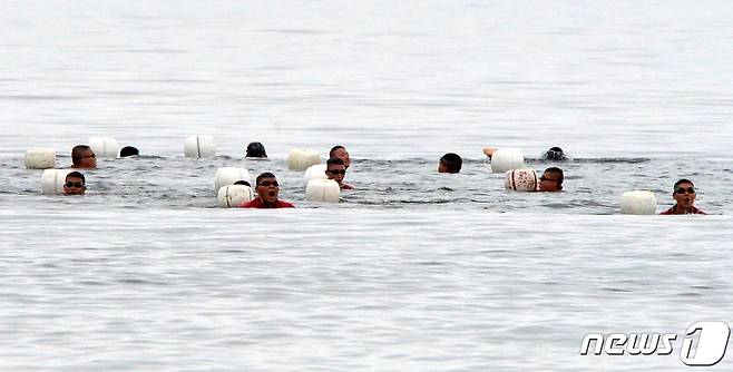 (포항=뉴스1) 최창호 기자 = 18일 해병대 1사단 장병들이 경북 포항시 남구 해안에서 전투수영훈련을 실시하고 있다.