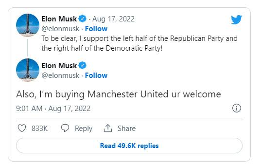 이렇다 보니 이날도 한 유저는 “이건 마치 예전에 트위터를 인수하겠다고 나섰을 때 트위터에 대해 했던 얘기”라고 지적했고, 머스크 CEO는 그 아래에 또 “만약 내가 스포츠팀 하나를 사게 된다면, 내가 어릴 때부터 가장 좋아했던 맨유가 될 것”이라고 추가로 답을 달았다.