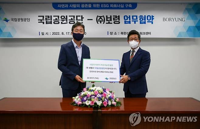 (서울=연합뉴스) 송형근 국립공원공단이사장(왼쪽)과 장두현 보령 대표가 지난 17일 서울 중구 국립공원공단 스마트워크센터에서 공원 내 안전사고 예방과 자연 보호를 위한 업무협약을 체결한 뒤 기념 촬영하고 있다. 2022.8.18 [보령 제공. 재판매 및 DB 금지]