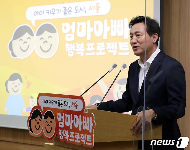 오세훈 서울시장이 18일 오전 서울시청 브리핑룸에서 육아 걱정 없는 도시를 만들기 위한 '엄마아빠 행복 프로젝트'를 발표하고 있다.